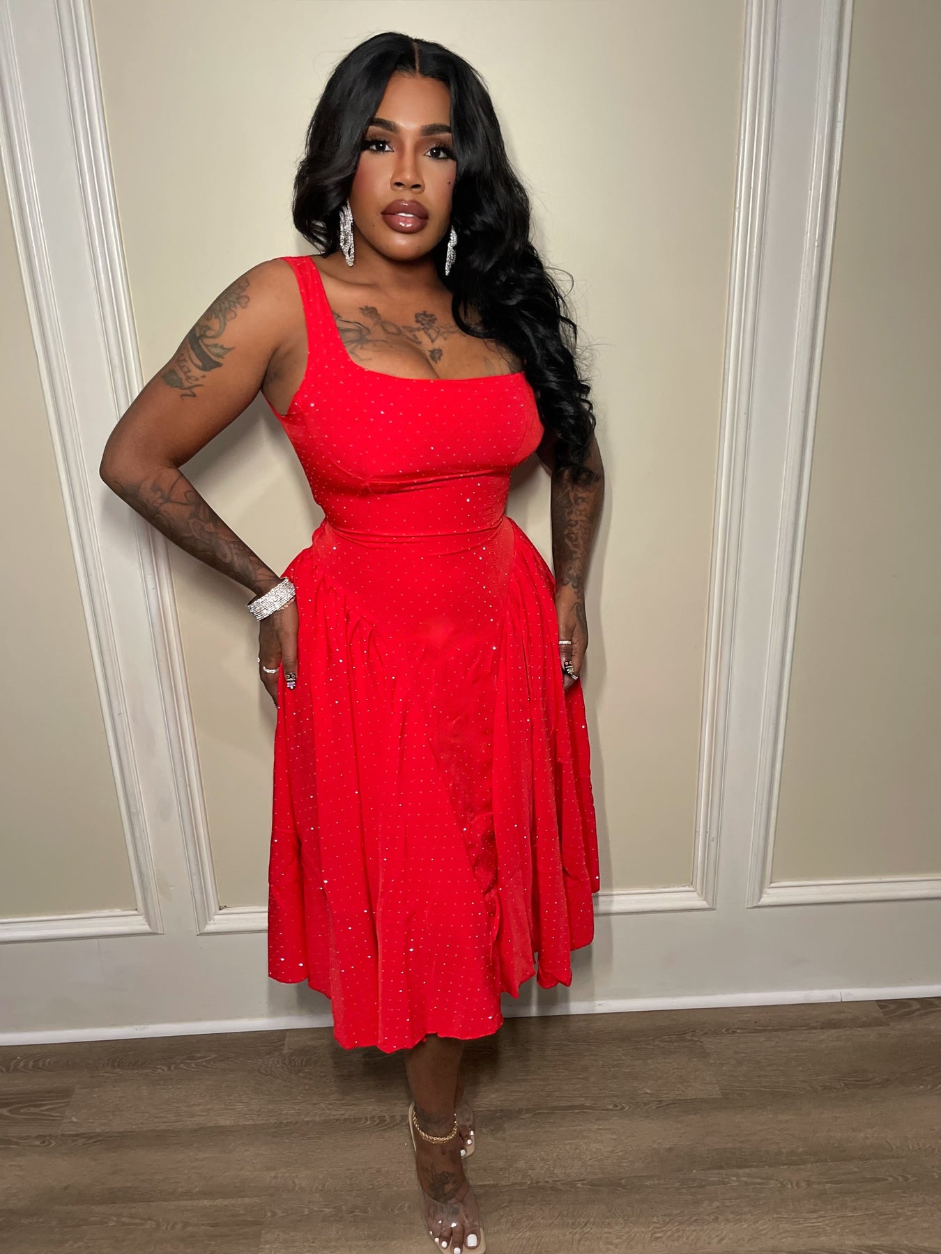 A bold, shimmering red dress designed to snatch the waist and flatter every curve. Features a structured square neckline, adjustable straps that tie in the back, and a fitted bodice that cinches the waist before flowing into a soft A line skirt. Elegant, feminine, and made to stand out this holiday season.