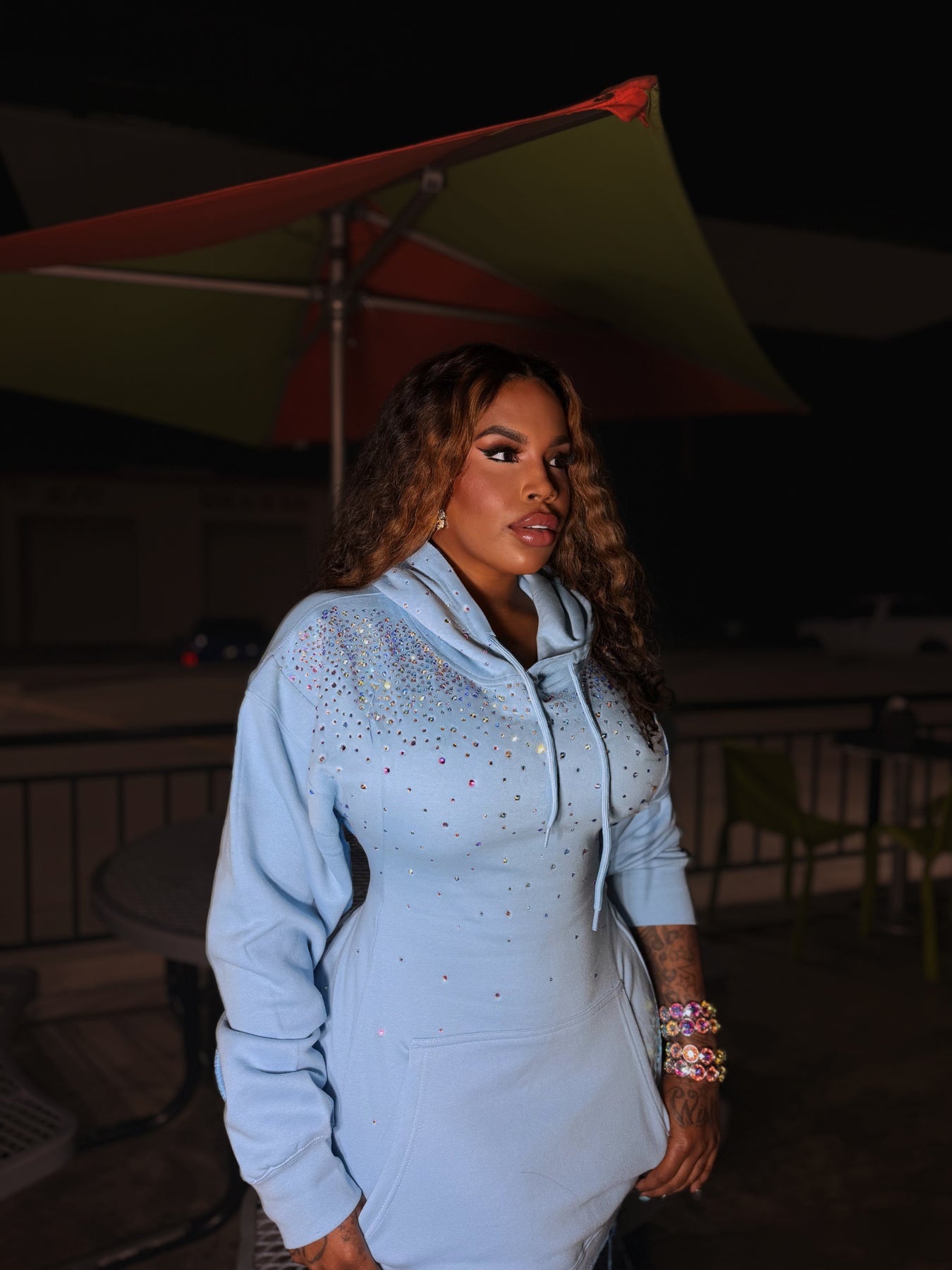 Turn heads day or night in our statement Iridescent Corset Hoodie Dress, designed to sculpt and highlight the perfect hourglass silhouette. This standout piece features shimmering iridescent stones that catch the light beautifully, giving a luxurious sparkle with every movement.