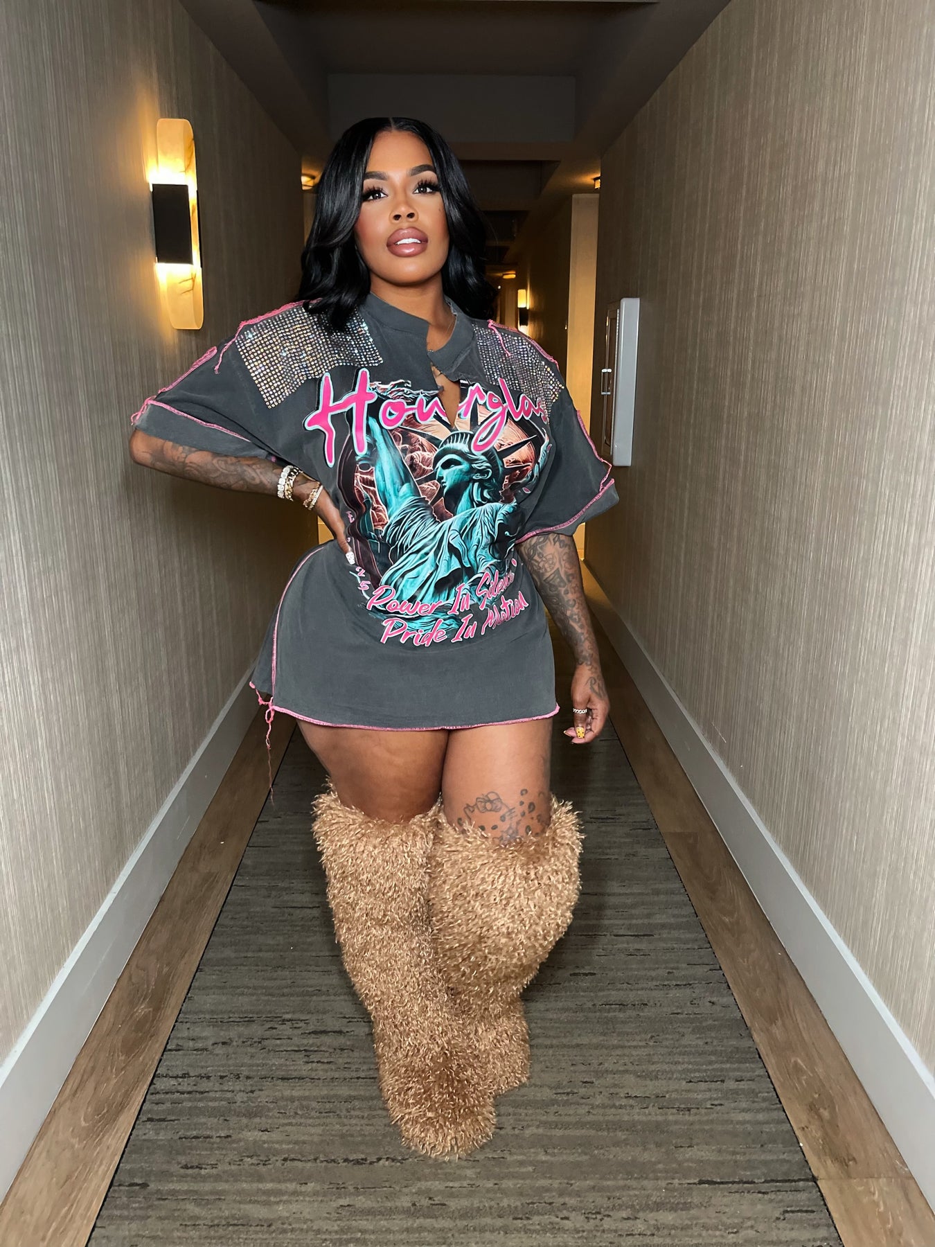 This oversized tee is perfect for all-day comfort and style. It is custom designed with AB stones to add a touch of sparkle. Available in L/XL, it's a must-have piece for any wardrobe. Stay comfortable and stylish while standing out in the crowd with our Hourglass Power is Silent Oversized Tee.